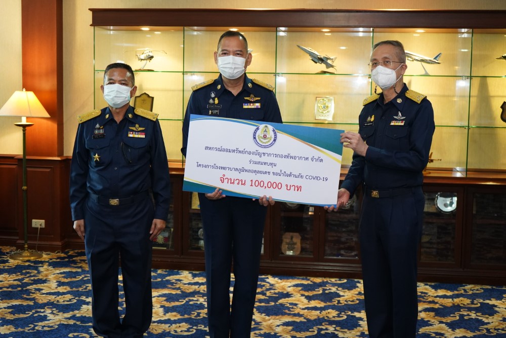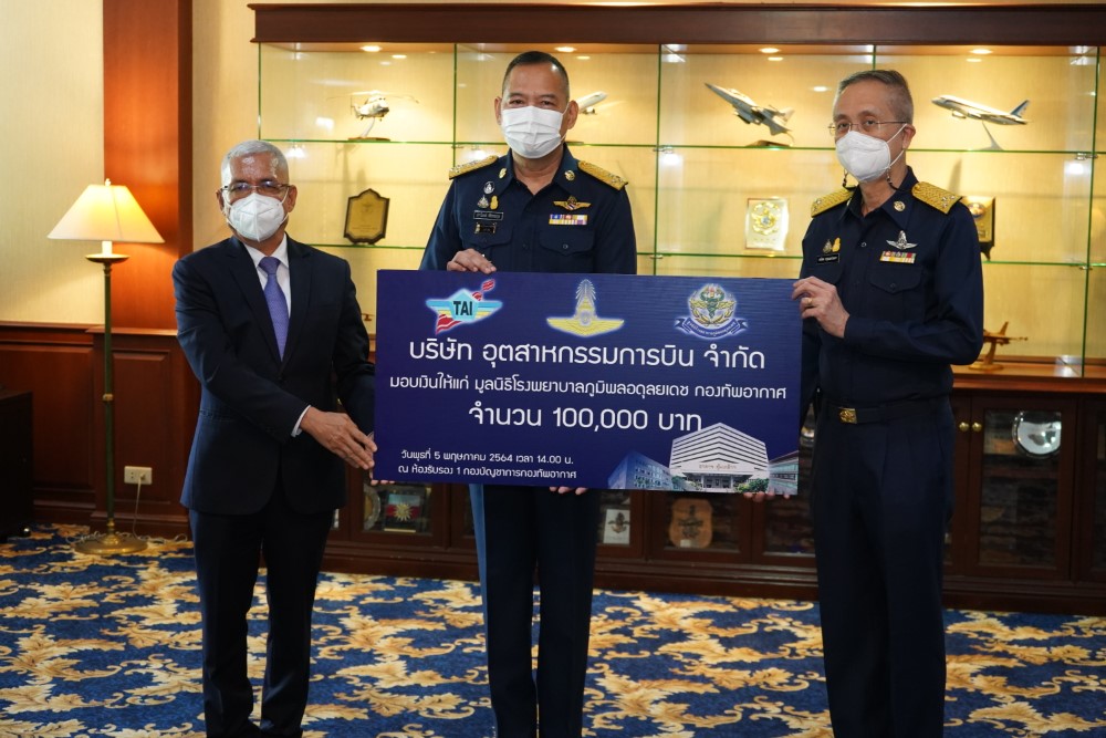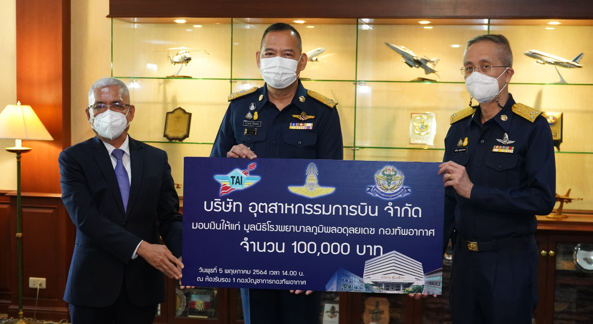 พลอากาศเอก ศุภชัย สายเงิน กรรมการผู้จัดการ บริษัท อุตสาหกรรมการบิน จำกัด (TAI) และ พลอากาศเอก ปราโมทย์ ศิริธรรมกุล ผู้ช่วยผู้บัญชาการทหารอากาศ (สายงานยุทธบริการ) ร่วมมอบเงินสนับสนุนให้แก่ มูลนิธิโรงพยาบาลภูมิพลอดุลยเดช จำนวน 100,000 บาท เพื่อสร้างขวัญและกำลังใจในการปฎิบัติงาน บุคลากรทางการแพทย์ ของกองทัพอากาศ โดยมี พลอากาศโท ธนวิตต สกุลแสงประภา เจ้ากรมแพทย์ทหารอากาศ เป็นผู้รับมอบ เมื่อวันที่ 5 พฤษภาคม 2564 ณ ห้องรับรองพิเศษ 1 กองบัญชาการกองทัพอากาศ โดยมี รองเจ้าเจ้ากรมแพทย์ทหารอากาศ ผู้อำนวยการโรงพยาบาลภูมิพลอดุลยเดช นายทหารผู้ใหญ่ และผู้แทนหน่วยงาน ร่วมเป็นสักขีพยานในการส่งมอบ