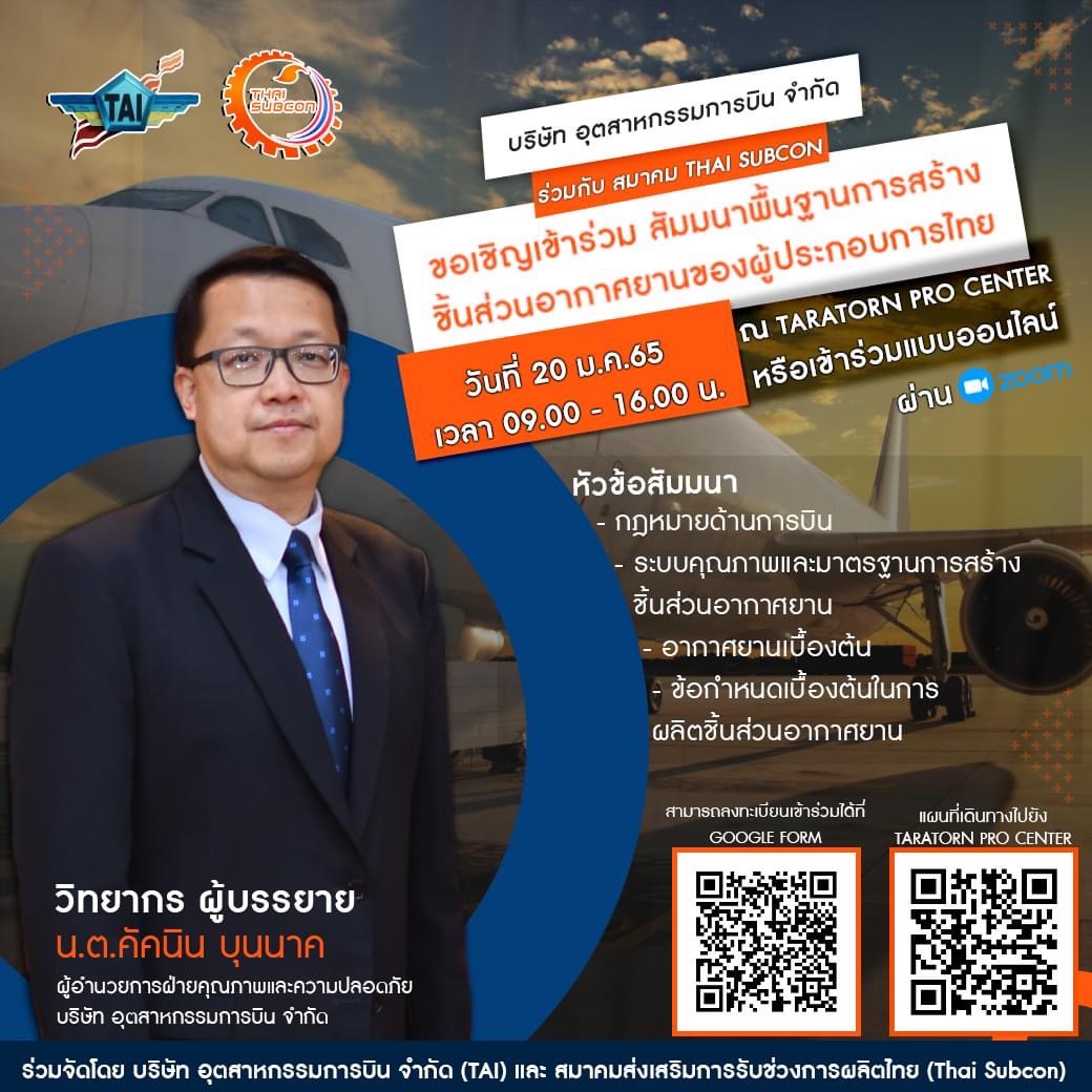 เราได้ร่วมสร้างและพัฒนาให้ผู้ผลิตชิ้นส่วนอุตสาหกรรมยานยนต์ ให้ก้าวข้ามต่อยอดเทคโนโลยีมาสู่การเป็นผู้ผลิตชิ้นส่วนอากาศยานได้สำเร็จ? และเรายังคงมุ่งมั่นที่จะสร้างผู้ผลิตไทยให้เข้าสู่การเป็นผู้ผลิตชิ้นส่วนอากาศยานอย่างต่อเนื่อง จึงกำหนดจัดงานสัมมนา (airplain)"พื้นฐานการสร้างชิ้นส่วนอากาศยานของผู้ประกอบการไทย" ซึ่งมีหัวข้อที่ผู้ประกอบการไทยจำเป็นต้องทราบ ตามกำหนดการ ดังนี้ 09.00 - 10.15 น. กฎหมายด้านการบิน 10.30 - 12.00 น. ระบบคุณภาพและมาตรฐานการสร้างชิ้นส่วนอากาศยาน 13.00 - 14.15 น. อากาศยานเบื้องต้น 14.30 - 16.00 น. ข้อกำหนดเบื้องต้นในการผลิตชิ้นส่วนอากาศยาน วิทยากรผู้เชี่ยวชาญ โดย น.ต.คัคนิน บุนนาค ผู้อำนวยการฝ่ายคุณภาพและความปลอดภัย บริษัท อุตสาหกรรมการบิน จำกัด (TAI) สัมมนาออนไลน์ ฟรี? ไม่มีค่าใช้จ่าย สำหรับผู้ที่ต้องการสัมมนา ณ TARATORN PRO CENTER ขอสงวนที่นั่งให้เฉพาะสมาชิกคลัสเตอร์อุตสาหกรรมการบินฯ และคลัสเตอร์อุตสาหกรรมป้องกันประเทศ สมาคมไทยซับคอนเท่านั้น (ที่นั่งมีจำนวนจำกัดเนื่องจากมาตรการป้องกัน Covid-19) ร่วมจัดโดย บริษัทอุตสาหกรรมการบิน จำกัด (TAI) และ สมาคมส่งเสริมการรับช่วงการผลิตไทย (Thai Subcon)