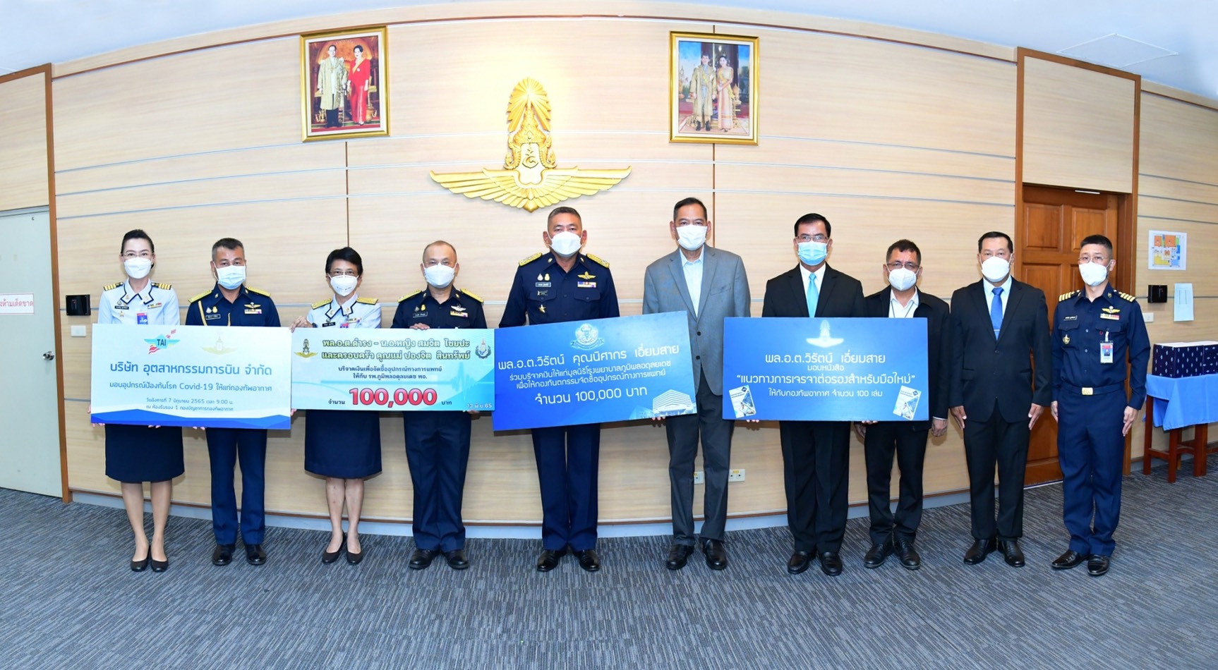 พลอากาศเอก ปราโมทย์ ศิริธรรมกุล ประธานคณะกรรมการบริหาร บริษัท อุตสาหกรรมการบิน จำกัด ร่วมกับ พลอากาศเอก ศุภชัย สายเงิน กรรมการผู้จัดการ บริษัท อุตสาหกรรมการบิน จำกัด ร่วมมอบอุปกรณ์ทางการแพทย์ เพื่อสนับสนุนการปฎิบัติงานของโรงพยาบาลภูมิพล เนื่องในโอกาสที่บริษัท ฯได้จัดกิจกรรมโครงการ TAI ร่วมใจสู้ Covid-19 โดยมี พลอากาศเอก นภาเดช ธูปะเตมีย์ ผู้บัญชาการทหารอากาศ เป็นผู้รับมอบ ในโอกาสนี้ พล.อ.ต.วิรัตน์ เอี่ยมสาย ที่ปรึกษากรรมการผู้จัดการ ร่วมบริจาคเงินให้แก่มูลนิธิโรงพยาบาลภูมิพลอดุลยเดช เพื่อให้กองทันตกรรมจัดซื้ออุปกรณ์ทางการแพทย์ จำนวน 100,000 บาทและ มอบหนังสือ "แนวทางการเจรจาต่อรองสำหรับมือใหม่ ให้กับกองทัพอากาศ จำนวน 100 เล่ม โดยมี พล.อ.ท.ไกรเลิศ เธียรนุกุล จก.พอ. พล.อ.ต.หญิง อิศรญา สุขเจริญ ผอ.รพ.ภูมิพลอดุลยเดช พอ. พล.อ.ต.ฉัตรชาย ธานีรัตน์ รอง จก.กบ.ทอ เข้าร่วมรับมอบสิ่งของและอุปกรณ์ เมื่อวันที่ 13 มิถุนายน 2565 ณ ห้องรับรอง สำนักงานผู้บัญชาการทหารอากาศ ทั้งนี้ โครงการ TAI ร่วมใจสู้ Covid-19 เพื่อสร้างขวัญและกำลังใจให้แก่บุคลากรทางการแพทย์, เจ้าหน้าที่ และอาสาสมัครซึ่งปฏิบัติงานในหน้าที่ในการดูแลและรักษาผู้ป่วยโรคติดเชื้อไวรัสโคโรนา 2019 และให้บริการด้านการฉีดวัคซีนให้แก่ประชาชน ที่ได้ดำเนินการอย่างต่อเนื่องและเต็มกำลังความสามารถ ในการให้ความช่วยเหลือและสนับสนุนภารกิจของบุคลากรทางการแพทย์ ตลอดจนเจ้าหน้าที่ของโรงพยาบาลในสถานการณ์การระบาดของโรคติดเชื้อไวรัสโคโรนา อุปกรณ์ที่ร่วมบริจาคในครั้งนี้ ประกอบด้วย ชุด PPE 3M, Alcohol Spray,Gel Alcohol , ชุด CPE Gowns ให้แก่บุคลากรทางการแพทย์โรงพยาบาลภูมิพล ณ มูลนิธิโรงพยาบาลภูมิพลอดุลยเดช