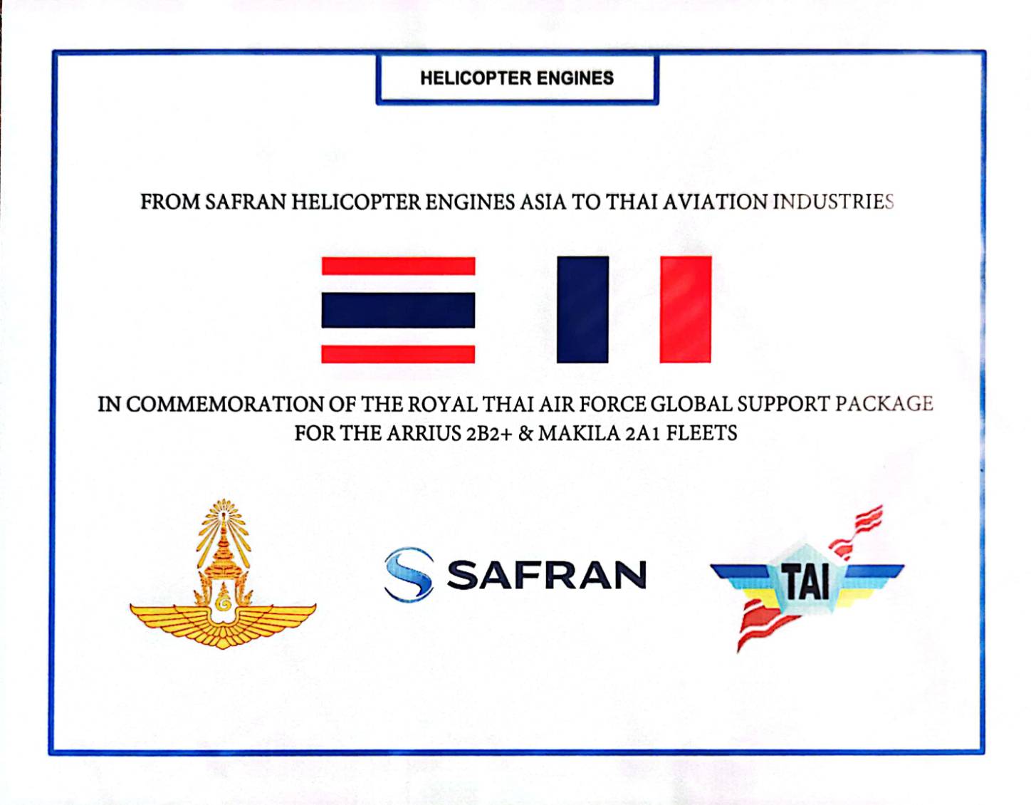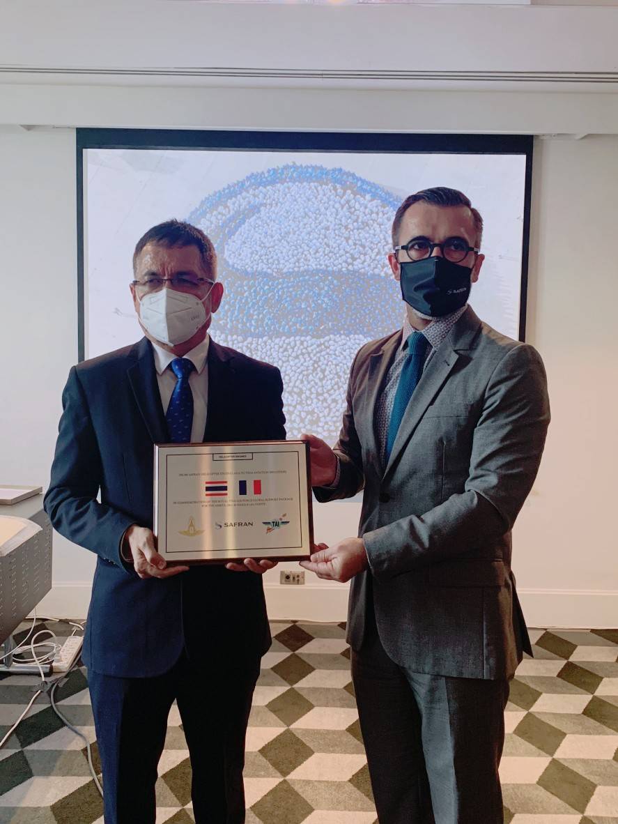 พลอากาศเอกศุภชัย สายเงิน กรรมการผู้จัดการ บริษัท อุตสาหกรรมการบิน จำกัด (TAI: Thai Aviation Industries) ให้เกียรติเข้าร่วมงาน Safran HE customer Day ในโอกาสนี้ TAI ได้รับโล่ที่ระลึกจาก MS Sebastien Mercadie Chief Financial Officer at Safran Helicopter Engines Asia Pte., Ltd. เป็นเครื่องหมายยืนยัน TAI ในฐานะตัวแทนจัดจำหน่ายชิ้นส่วนอะไหล่เครื่องยนต์จาก Safran (HE) ประจำประเทศไทย เมื่อวันที่ 19 พ.ค. 2565 ณ โรงแรมพูลแมน จี กรุงเทพ TAI ได้มีข้อตกลงความร่วมมือ (Distributorship Agreement) กับ Safran (HE) ให้ TAI เป็นผู้แทนขายการบริการและการสนับสนุน พร้อมทั้งได้รับสิทธิในการขายครอบคลุมลูกค้าในส่วนของเครื่องยนต์ Makila และ เครื่องยนต์ Airrus ของ Safran (HE) ที่ใช้งานในภารกิจทางทหารและหน่วยงานภาครัฐ ทั้งหมดในประเทศไทย ภายใต้ความเป็นหุ้นส่วนกับ Safran (HE) นี้ ครอบคลุมถึงเครื่องยนต์ในรูปแบบการบริการในลักษณะ Global Support Package (GSP) ซึ่งเป็นหลักประกันว่า เครื่องยนต์จะมีความพร้อมใช้งาน โดยดำเนินการผ่านขีดความสามารถของ TAI ที่เป็นผู้ให้บริการซ่อมบำรุงอากาศยานหลักภายในประเทศไทย ในความเป็นหุ้นส่วนกับ Safran (HE) มีรูปแบบความร่วมมือครอบคลุมถึงการส่งกำลังและการซ่อมบำรุง, โรงซ่อม, การจัดการสินค้าคงคลัง ตลอดจนการสนับสนุนทางเทคนิคโดยผู้เชี่ยวชาญ เพื่อให้มั่นใจได้ว่าเครื่องยนต์จะมีความพร้อมใช้งานทุกเมื่อ ปัจจุบัน กองทัพไทยมีการจัดหาเฮลิคอปเตอร์จาก Airbus Helicopters ซึ่งใช้เครื่องยนต์ของ Safran (HE) เป็นจำนวนมากหลากหลายแบบ โดยใช้เครื่องยนต์ Turboshaft แบบ Makila ซึ่งถูกติดตั้งกับเฮลิคอปเตอร์ EC725 (H225M) ของกองทัพอากาศไทย (Royal Thai Air Force) และเครื่องยนต์ Turboshaft แบบ Arriel ถูกติดตั้งใช้งานกับเฮลิคอปเตอร์ลาดตระเวน/ติดอาวุธ ฮ.ลว./อว.550 AS550 C3 (H125M) ของกองทัพบกไทย (RTA: Royal Thai Army), H145M ของกองทัพเรือไทย(Royal thai navy), เฮลิคอปเตอร์ค้นหาและช่วยชีวิต AS365N3+ และเฮลิคอปเตอร์ใช้งานทั่วไป H155 (EC155B-1) ของสำนักงานตำรวจแห่งชาติ (RTP: Royal Thai Police) และ H155 ของกรมแผนที่ทหาร (Survey Department) นอกจากนี้ TAI และ Safran (HE) ได้ลงนามในสัญญาเพื่อสนับสนุนเครื่องยนต์ Arrius 2B2Plus ของกองทัพอากาศไทย (RTAF) และเครื่องยนต์ Makila โดยดำเนินการส่งกำลังให้กับ เฮลิคอปเตอร์ H135 และ H225M เครื่องยนต์ Arrius มากกว่า 12 เครื่อง และ เครื่องยนต์ Makila จำนวน 24 เครื่อง ผ่านการให้บริการแบบ GSP ของ Safran (HE) ตั้งแต่ปี 2560 แสดงให้เห็นถึงประสิทธิภาพในการตอบสนองความต้องการของกองทัพอากาศ เพื่อให้มีความพร้อมใช้งานในการปฏิบัติภารกิจ โดยดำเนินการผ่านการให้บริการจาก TAI ซึ่งเป็นศูนย์ซ่อมบำรุงที่ได้รับการรับรอง ให้บริการสนับสนุนเครื่องยนต์ทางการทหารและหน่วยงานภาครัฐในประเทศไทย ภายใต้ GSP ลูกค้าจะได้รับการรับประกันว่า จะมีเครื่องยนต์ที่สามารถซ่อมบำรุงได้ทุกเมื่อที่ต้องการ รวมถึง
